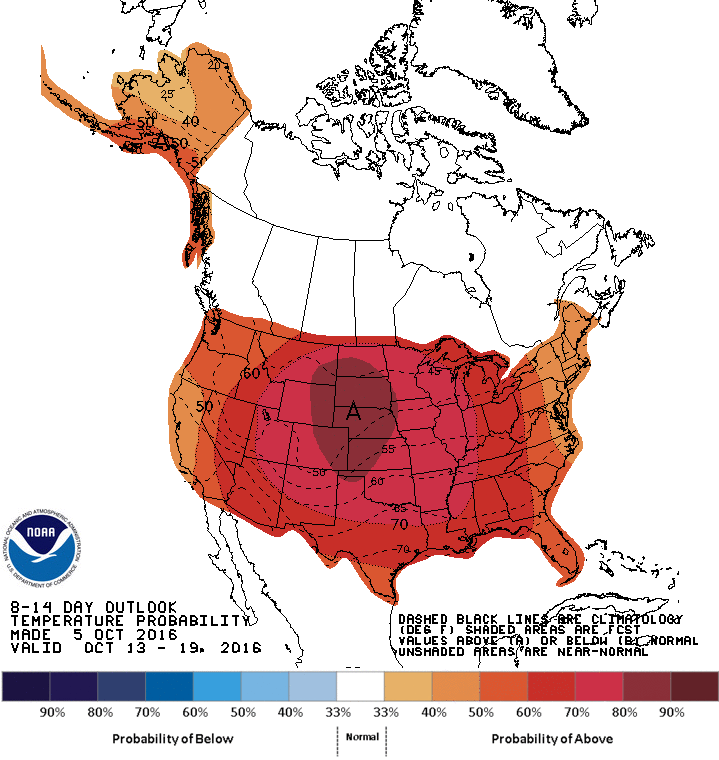 The cool down will be short lived as warmer air will once again return to the area. Average highs for the early to mid part of October are near 70. The 6-10 day outlook (October 11th thru 15) calls for above average temperatures, along with the 8 to 14 day (October 13th thru 19th).